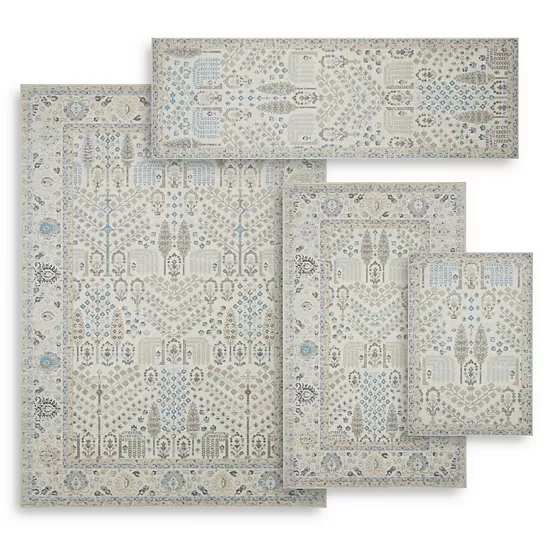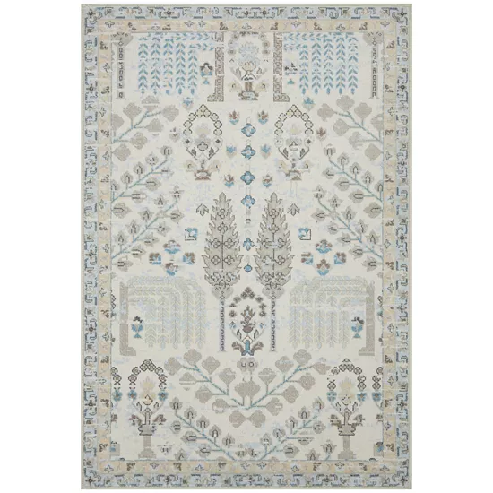 This machine-washable Loloi X Sonoma Goods For Life® Espen Scandinavian rug features nature-inspired motifs in a serene palette of pale blue, beige, and ivory.