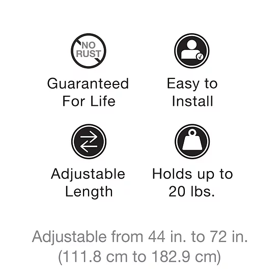 - Adjustable length to fit tub and shower spaces from 44 to 72 inches