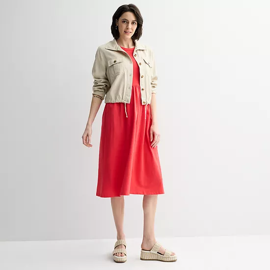 Embrace effortless elegance with this Sonoma Goods For Life mixed media knit dress, designed to flow gracefully with your every movement. Perfect for casual outings or dressy occasions, its versatile silhouette flatters all body types, making it an ideal choice for any woman’s wardrobe.